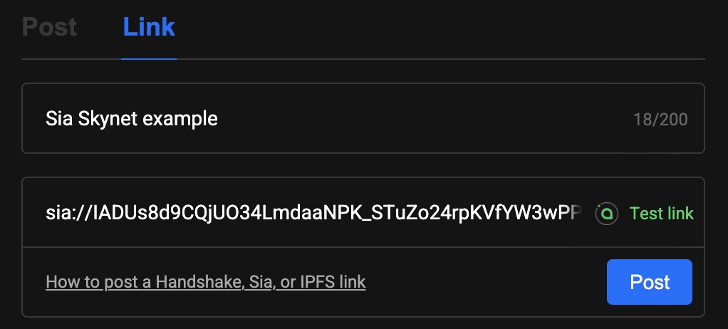 Para publicar un enlace Skynet alojado en la red de almacenamiento Sia, introduce tu Skylink con el prefijo "sia: //"